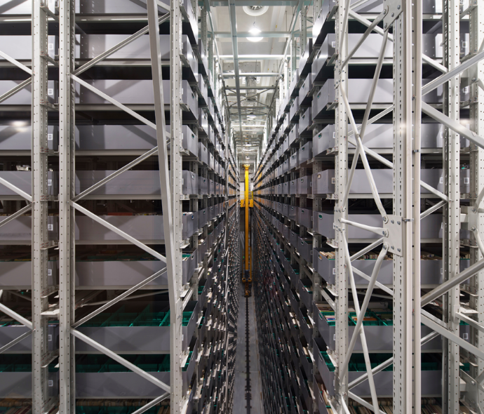 国内单体藏书量最大的智慧化立体书库,可存放 715 万册图书,主库区建设面积约 3000 平方米,书库高度 16 米, 配备有 13 台大型的堆垛机,共计 32232 个货位,采用金属书箱来保存书籍。搭配图书自动分拣设备和智能搬运机器人, 实现了图书自动出库、自动分拣、自动配送。读者在手机端或智慧桌面上检索和借阅图书,15 分钟内便可在数百万册图书 中完成拣选。