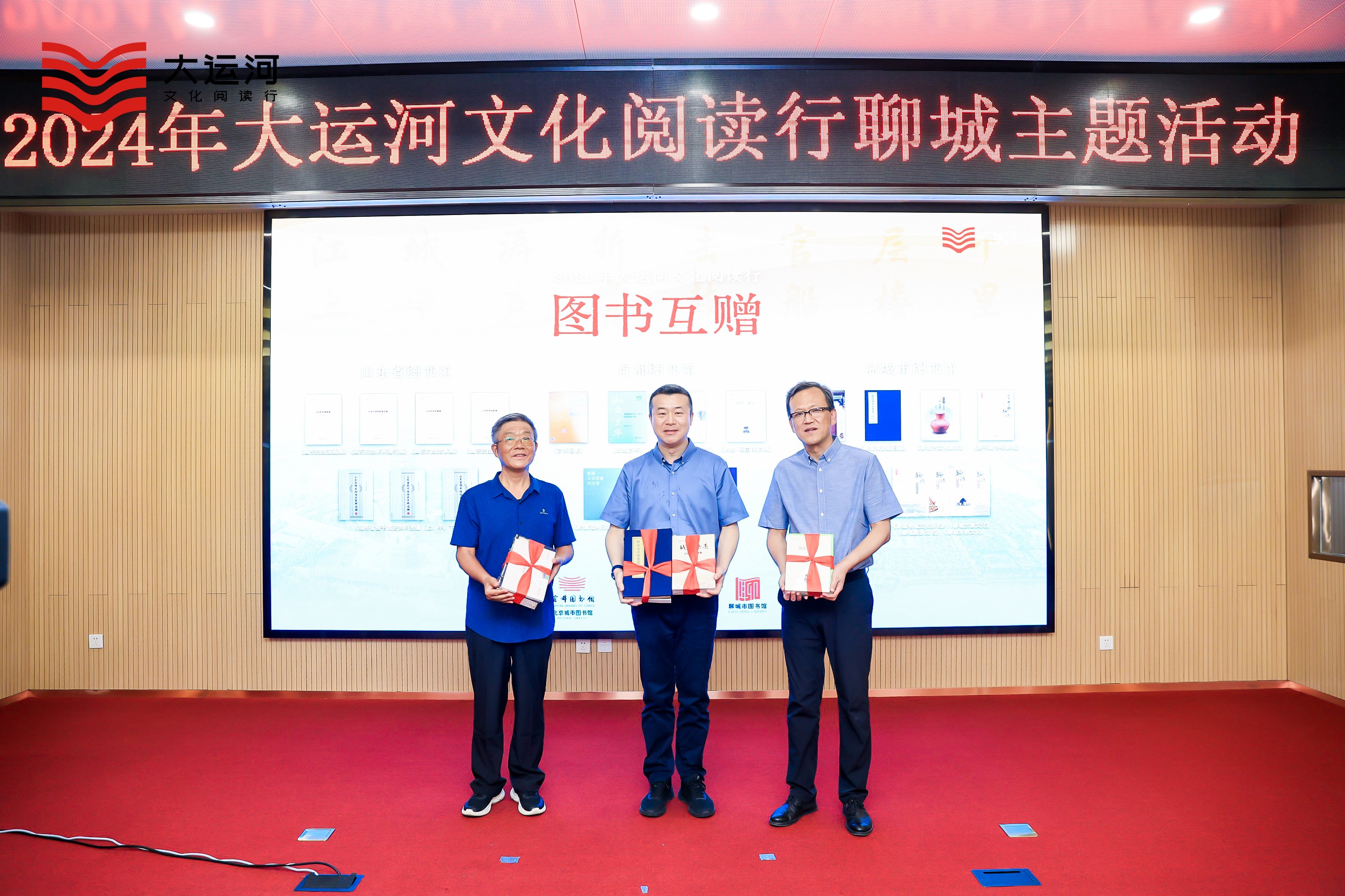 聊城运河长卷山东段的绘制,由首都图书馆党委书记许博,山东省图书馆党委委员、副馆长吕承睿,聊城市图书馆馆长林虎,共绘第一笔。随后三位馆长进行了图书互赠仪式,体现出图书馆在传承运河文化与推动运河文化传播中的积极交流与互动。