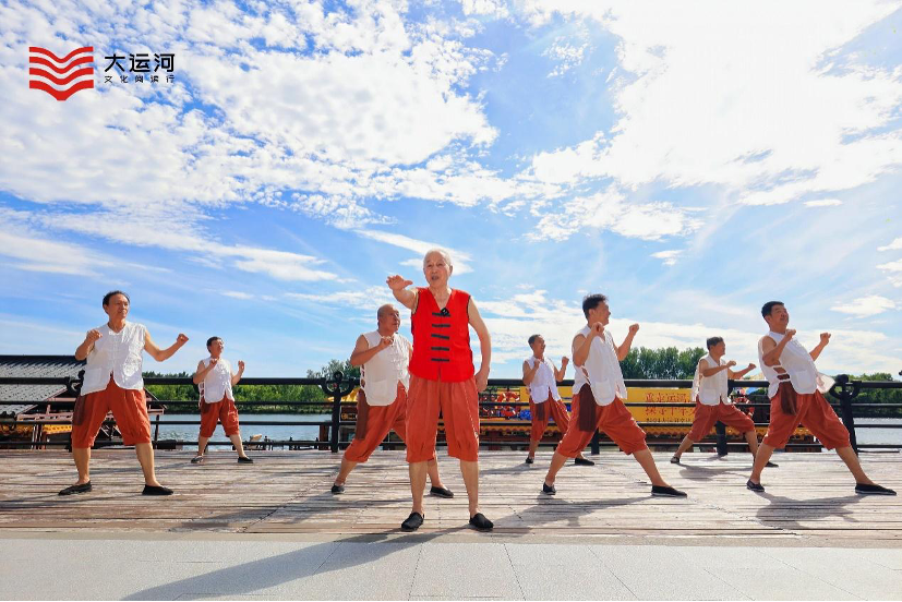 “开船喽…….”大运河森林公园漕运码头上,通州运河号子第四代传承人赵义强老师带领团队展示了铿锵有力的表演,引来大运河森林公园的游客驻足。