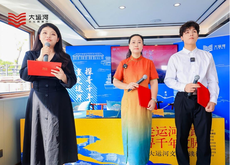 “天际沙明帆正悬,翩翩遥望影相连。漕艇贾舶如云集,万国梯航满潞川。”在轻柔舒缓的配乐声中,中国诗歌协会会员、金牌阅读推广人张文娟、北京现代音乐研修学院播音朱俊杰、赵晨妍,通过《千年大运河:古典诗词的黄金水道》古诗诵读,演绎了中国大运河沿途八省市的八首代表性特色古诗。朗读者声情并茂地表达与船外的北运河绚丽风景融为一体,不禁令人入情入景,思绪跃古今。